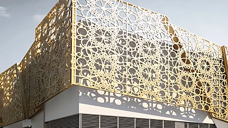 Intricate latticework facades combining traditional designs with modern materials, providing natural ventilation and aesthetic appeal for homes or commercial buildings.